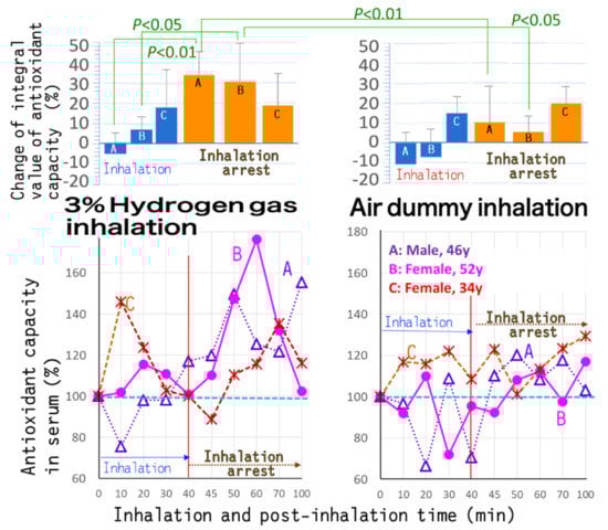 The ORAC-fluorometry-based antioxidant ability in serum was demonstrated to be appreciably increased for 3% hydrogen gas inhalation LA for 40 min in three healthy subjects (Figure 2). In contrast, no marked increase in serum antioxidant ability was brought by air sham inhalation under similar conditions, which was conducted as the dummy treatment. Time-course bent-line graphs were calculated as “± values” versus the initial antioxidant capacity for the areas under the bent line, and integrated for times (Figure 2). The integral values for each subject were expressed both “during inhalation” and “after inhalation arrest”, respectively. The tendencies were observed typically for two subjects of approximately 40 and 50 years (Figure 2 upper graph A,B) more obviously, than a hydrogen-responsive subject of 30 s (ibid C).