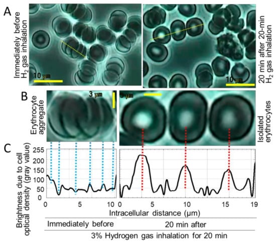 A subject (female, 46 years old) inhaled 3% hydrogen gas for 20 min, while whole blood was collected before/after the inhalation. (A) The erythrocytes were observed to be aggregated or individually separated under a microscope, either of which is indicated with the yellow line-selected erythrocytes (3–5 cells); (B) the microscopic photographs were enlarged for both the concerned cellular states; (C) erythrocytes at states of aggregation/separation were scanned along the yellow lines, and expressed as opticometric line histograms, with a software Image J, indicating that the peak heights become larger as cell-regional optical densities (cell-regional brightness; gray values) are more marked.