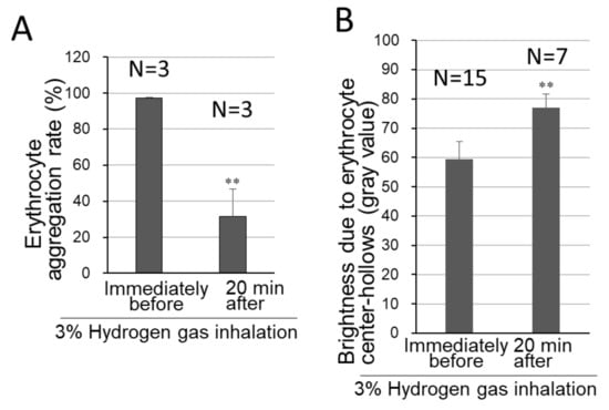 Degrees of erythrocyte-aggregation suppression and biconcave-discoid shape-retention by hydrogen gas inhalation. Before/after inhalation of 3% hydrogen gas for 20 min, whole blood was collected and analyzed for erythrocyte morphology, as in Figure 3. N represents the number of the examined video-extracted still images before/after hydrogen inhalation. (A) The erythrocyte-aggregation rates were quantified for numbers of aggregated erythrocytes (Figure 3A,B). (B) The opticometry in the cell-central parts containing “central pallor”, was conducted for the biconcave discoid morphology necessary for either erythrocyte cell-flexibility or passing through the capillary vessels, as shown in the cell-brightness-based line-histogram (Figure 3C). The still images and microscopic photographs were analyzed, and shown as mean ± SD, erythrocyte aggregation rate: n = 3; average of gray values: n = 15, immediately before inhalation and n = 7 for 20 min after the inhalation ended. ** p < 0.01 (versus immediately before 3% hydrogen gas inhalation).
