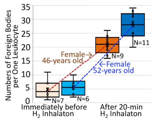 Increases in numbers of intracellular foreign bodies in leukocytes after hydrogen gas inhalation. The subjects inhaled 3% hydrogen gas for 20 min, as in Figure 5, and were evaluated for numbers of foreign endogenous bodies with no count of vacuoles or cysts, per single leukocyte. The intracellular foreign bodies per one leucocyte were quantitatively analyzed for specified number (n) of microscopic still-image specimens, each of which contained mostly one, in part two, leucocytes being coexistent among abundant erythrocytes, before/after hydrogen inhalation in two subjects of 46-year-old and 52-year-old females. The individual values for the intracellular foreign bodies per single cell are indicated by open circles, and expressed by a quartile method-based box–whisker plot.