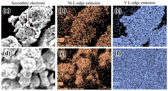 Apparently, V and Ni are homogeneously distributed over the secondary particle surface, thus suggesting the alloy formation and the absence of elemental phase segregation. It is to be noted that the Ni X-ray signal is unavoidably much smaller compared to the vanadium signal: this inevitably imposes a balance between the definitions of the elemental maps and matching with micrographs (see as examples the poor special resolution of the Ni map in Figure 2b, or the special saturation of the V map in Figure 2f. The successful synthesis of a homogeneous V-Ni alloy is confirmed by XRD as well as the lack of extended phase contamination (see Figure 3).