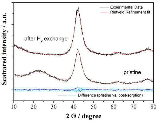 X-ray diffraction patterns before and after H2 sorption compared to the Rietveld refinement fits and experimental-to-fitting difference lines.