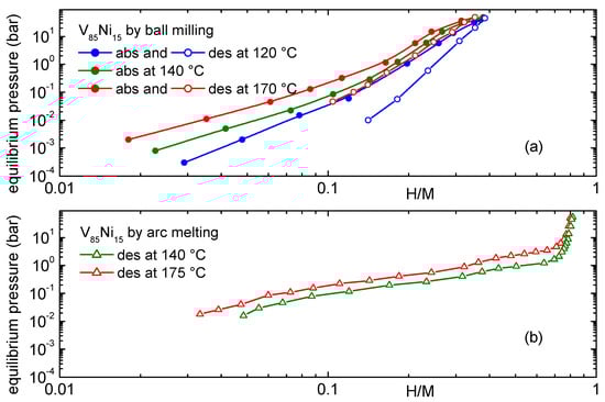 Above H/M ≈ 0.08, the equilibrium pressure of ball-milled V85Ni15 starts to deviate from the Sieverts law, and one can speculate that the sample will reach a pressure plateau above the maximum pressure investigated here (p~45 bar).The shapes of the absorption and desorption isotherms are clearly different from those of Vi85Ni15 previously synthesized by arc melting, which are reported for comparison in Figure 4 at the same temperatures of those obtained for the ball-milled sample. In the sample synthesized by arc melting one observes an initial linear increase in the pressure as a function of H/M in a double logarithmic scale below H/M~0.08 [11,25]. At higher concentrations, two different slopes are evident, for 0.1 < H/M < 0.3 and for 0.4 < H/M < 0.6 [11]. These findings were previously interpreted as evidence of the occurrence of a solid solution of H in the alloy for H/M < 0.08 (α phase), and the subsequent transformation of two different hydride phases, called β1 and β2 [11]. These hydrides have different dehydrogenation enthalpies: ΔHdehydr = 21 ± 1 kJ/mol for 0.15 ≤ H/M ≤ 0.30 and ΔHdehydr = 26 ± 2 kJ/mol for 0.53 ≤ H/M ≤ 0.59 [11]. It was reported that, above 300 °C, there is no evidence for the formation of hydrides in V85Ni15 produced by arc melting and only an α phase is present up to the maximum measured composition, with a hydrogenation enthalpy ΔHhydr = 10.0 ± 0.5 kJ/mol [11].