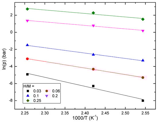 From the hydrogen absorption curves of ball-milled V85Ni15 one can calculate the enthalpy and entropy changes during the hydrogenation by means of a Van’t Hoff plot, reporting the logarithm of the equilibrium pressure as a function of the inverse of the absolute temperature and fitting the data by a linear regression. Usually, this method is applied to materials showing almost horizontal plateau pressures; however, it can also be applied to materials with sloping equilibrium pressure, provided that the equilibrium pressures at fixed hydrogen compositions are analyzed [26,27].