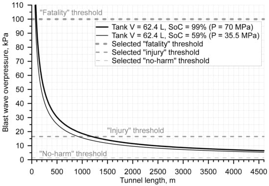 Experimental [29,30,31] and numerical [4,13,32,33] studies on the performance of hydrogen storage tanks in a fire, the consequences of tank rupture, and the mechanism of blast wave formation and decay have been carried out for the open atmosphere. Only partial data are available on high-explosive charges with the mass equivalent to that of trinitrotoluene (TNT). The TNT blast wave, on the other hand, differs from the blast wave generated by a hydrogen tank rupture in a fire, by the process of the release of chemical energy. The dimensionless correlation [21], which has been developed using simulations by a validated CFD model and recently validated against tank rupture in real tunnel experiments of CEA [34], is applied in this study to calculate the blast wave decay in the tunnel after the rupture of a 62.4 L, 70 MPa tank at SoC = 99% (70 MPa at 20 °C) and SoC = 59% (35.5 MPa at 20 °C). The dimensionless correlation [21] allows for consequence assessment for the rupture of any hydrogen tank in a fire inside a tunnel of any cross-section area, aspect ratio, and length. The calculated overpressure decay along the Dublin Tunnel is shown in Figure 3 together with three thresholds (fatality, injury, and no-harm).