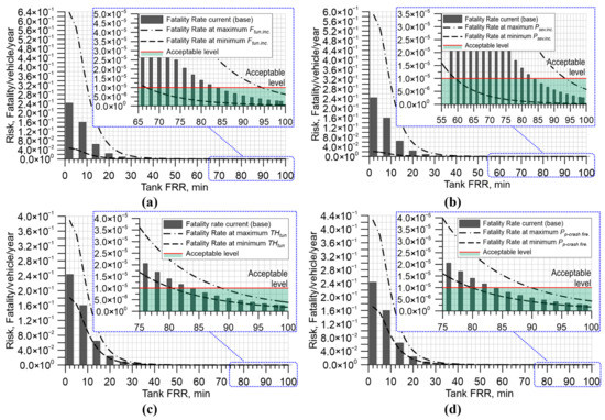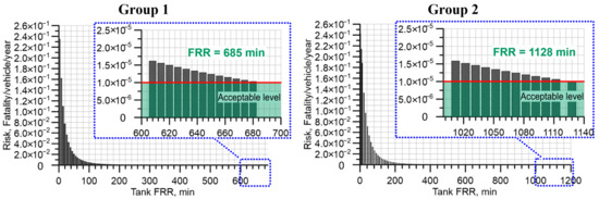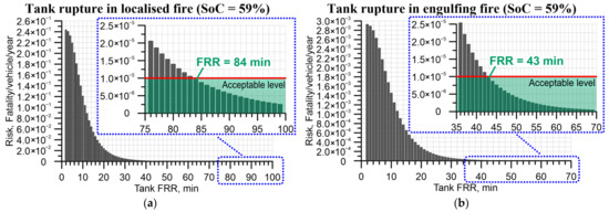 It can be seen in Figure 4a that for a hydrogen tank in a localised fire with = 8 min [43] the risk is 1.6 × 10−1 fatality/vehicle/year, which is more than four orders of magnitude bigger than the acceptable level (shown with a red line and a green transparent filling under it in the secondary inserted graph with blue dotted frame). The risk for engulfing fire (Figure 4b) is lower for the same FRR = 8 min, i.e., 1.92 × 10−3 fatality/vehicle/year, yet unacceptable.