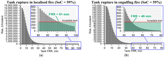 The cost of an incident becomes very high when it comes to the aforementioned conformable tanks with FRR = 2 min, i.e., 14.1M GBP/incident for localised (Figure 5a) and 169k GBP/incident for engulfing fire (Figure 5b), respectively.