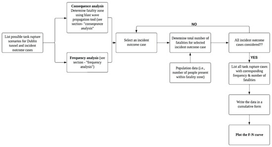 It is important to demonstrate the suggested mitigation measure’s validity for risk reduction to socially acceptable levels while taking into account all the potential tank rupture scenarios within the Dublin Tunnel, in addition to the incident scenario that was already investigated. For this purpose, the Frequency–Number of fatalities (F–N) curves show the overall risk level for different possible tank rupture incident outcomes. The F–N curve is the most common way in QRA studies to express a collective risk and the frequencies at which such multi-fatality events would be tolerated within socially acceptable criteria. The F–N curves are cumulative distributions that graphically relate the number of fatalities (N) in an incident to the occurrence frequency (F) causing the ‘N’ or more fatalities [46]. Such graphical representation of societal risk expands the risk indicators as they depict the likelihood of all possible incident scenarios with different severities of consequences, i.e., fatalities. At the same time, it proves the significance of the proposed mitigation measure for overall risk reduction [47]. Since the cumulative frequency values and the number of fatalities vary by several orders of magnitude, the logarithmic scales are typically used for F–N curves. The methodologies for building F–N curves have been extensively studied over the years for chemical industries [48]. A similar model for F–N curve generation based on the literature [48] has been developed in this section for analysing hydrogen tank rupture scenarios in tunnels (see Figure 6.).