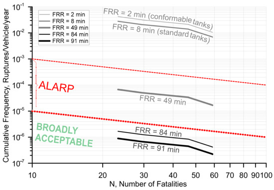 As can be seen in Figure 7, the societal risk associated with conformable tanks and standard tanks with FRR = 2 min and FRR = 8 min, respectively, is high and occurs in the region of intolerable risk level above ALARP. The increase in FRR to 49 min reduced the risk by almost three orders of magnitude within the ALARP region. The risk is reduced even further to a negligible (or broadly acceptable) level (below ALARP), as the tank FRR is increased to 84 min and even further to 91 min. This proves again the validity of the proposed risk reduction measures (“infinitely” increased tank FRR and the use of self-venting µLNB safety technology) for reducing the overall risk level of onboard hydrogen tank rupture in the road tunnel considering all potential incident outcome cases.