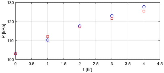 Pressure evolution in a closed tank: blue circles, experimental data; red squares, numerical results.