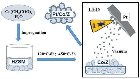 Monodispersed Pt nanoparticles were deposited on HZ or Co/Z using laser electrodispersion (LED) technique, described in detail in [62,63]. The deposition time was chosen based on the rate of Pt deposition determined previously [65]. It was 110 or 550 s to load 0.01 or 0.05 wt.% Pt on 1g of zeolite. In some cases, the order was reversed—first platinum was deposited by LED, and then cobalt was introduced by impregnation. Depending on the synthesis procedure, the samples were designated as Pt/Co/Z or Co/Pt/Z. The schematic diagram of the typical synthesis of Pt/Co/Z catalysts is shown in Figure 1. The catalysts were stored in air and activated before catalytic tests by heating for 1 h at 350 °C in He. All prepared catalysts are listed in Table 1.