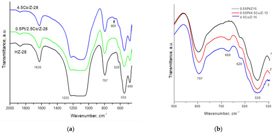 Figure 3 shows the FTIR transmittance spectra of initial and Pt/Co-modified zeolites Z-28 and Z-30 in the ranges 450–2000 and 500–900 cm−1. The bands near 1100–1200, 797, and 458 cm−1 are assigned to vibrations of TO4 (T = Si or Al) tetrahedra; the bands at 620 and 550 cm−1 are characteristic of double-rings of tetrahedra in the framework [68]. As can be seen in Figure 3, the position of the bands at 550 and 797 cm−1 did not change in all samples, indicating that the structure of ZSM-5 did not alter after loading Co by impregnation and Pt by LED methods.