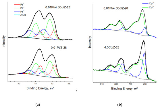 The analysis of XPS spectra of Pt-modified zeolites with low Pt loading is a challenge due to overlapping of the Pt4f and Al2p lines. Earlier Pt/Al2O3 catalysts with ultralow metal loadings of 0.02–0.005 wt.% also prepared by LED were successfully studied by XPS [65]. Along with the Al2p component, three Pt4f doublets with the spin-orbital splitting of 3.34 eV attributed to Pt0, Pt2+, and Pt4+ species were used for the fitting of overlapped Pt4f–Al2p spectra. The doublet of asymmetrical lines was used for the Pt0 components, and for the other components, doublets of symmetrical lines. The typical Pt4f spectra are shown in Figure 4a. with an example of the Pt- and Pt-Co-modified Z-28. The binding energies (BE) of the Pt4f7/2 components resulted from the spectra fitting along with those for Co2p3/2, and Al2p are given in Table 3 for monometallic and bimetallic samples. The Pt4f binding energies are close to those reported for Pt0 and oxidized Pt2+ and Pt4+ species or PtO and PtO2 oxides [56,58,65]. In addition, the component with the medium binding energy between 72.4–72.6 eV can also be linked to partially positive Pt species (Ptδ+: 0 < δ < 2) [24], and the component with the highest BE can be attributed not only to Pt4+ species but also to Pt2+ cations in the ion-exchange positions of HZSM-5 [71]. It may refer to the Ptn+ (2 < n < 4) in the form of PtOxAl strongly bound to the Al sites in zeolite that arises during the exchange of positively charged PtOx particles with protons of the acid sites, as was shown for Pd-modified zeolites [64,72].