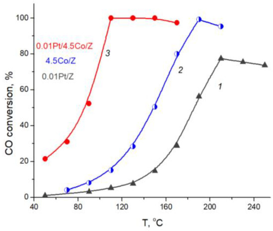 Temperature dependences of the CO to CO2 conversion in a H2-rich mixture are shown in Figure 5, as an example of the 0.01Pt/4.5Co/Z-15 sample and its monometallic analogs. Temperature dependences of the CO conversion are extreme passing through a maximum when an undesirable reaction of the hydrogen oxidation starts, that reduces the selectivity of the process. The best catalytic behavior is determined by the highest degree of CO conversion at the lowest temperature. Another requirement for a good PROX catalyst is a wide temperature range (∆T100) of 100% CO conversion. It can be observed that the monometallic Pt-zeolite is the least active, which is not surprising due to such a low 0.01% Pt content. Only 78% CO conversion can be achieved at 210 °C. Cobalt-modified zeolite has slightly better properties, providing almost 100% conversion of CO at 190 °C, but with a further increase in temperature, the conversion drops sharply. This is associated not only with the side process of hydrogen oxidation, but also with a strong deactivation of cobalt-containing catalysts [19]. The best catalytic behavior is observed for a bimetallic 0.01Pt/4.5Co/Z-15, of which 100% conversion is already achieved at 110 °C and decreases only to 97% as the temperature rises to 170 °C. Thus, a synergistic action of the two metals is observed, leading to a significant increase in the catalytic activity. The high activity of bimetallic Pt-Co catalysts of various structures has been repeatedly noted in the literature [36,37,38,39,40,41]. However, such a strong improvement in catalytic properties of Co-modified zeolites with the introduction of such small (0.01%) Pt loading seems to be rather surprising.