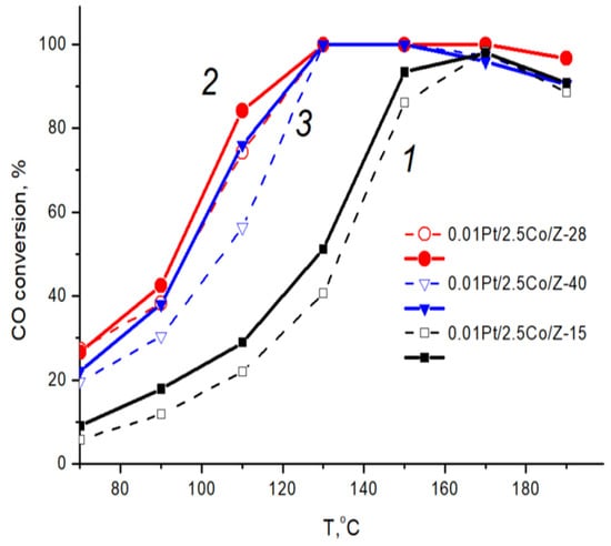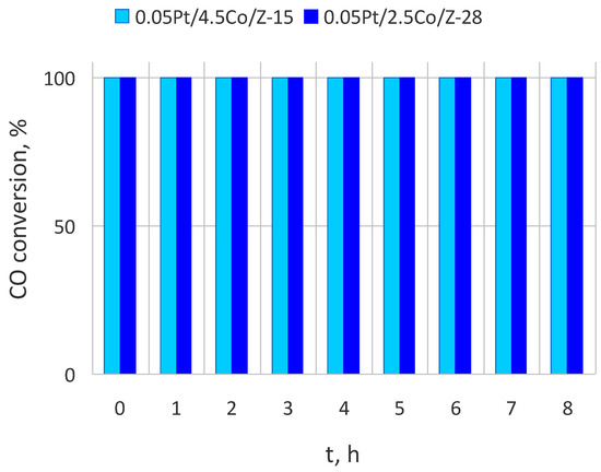 As can be seen in Table 5, both catalysts 0.05Pt/4.5Co/Z-15 and 0.05Pt/2.5Co/Z-28 are highly active and stable. As seen in Figure 7, after heating even to low temperatures (50–70 °C) in the reaction medium, the 0.05Pt/4.5Co/Z-15 activity increases to 100% at 50–150 °C, and only slightly reduces to 97 % at 170 °C. Similar behavior was also observed for 0.05Pt/2.5Co/Z-28, where the operating temperature range (ΔT100) is significantly extended for both catalysts. As seen in Figure 8, these catalysts with the optimal composition provide the 100% CO conversion within at least 8 h.