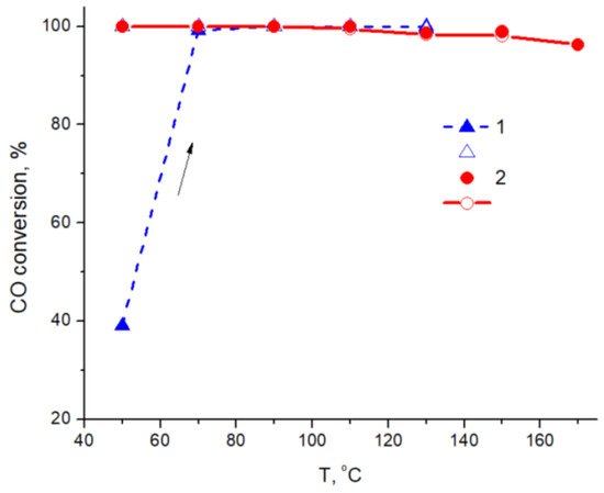 Temperature dependences of CO conversion on 0.05Pt/4.5Co/Z-15 in successive heating–cooling cycles (1 and 2). Shown are the data for two heating–cooling cycles: dotted line and solid symbols correspond to the heating cycle, while solid line and open symbols correspond to the cooling. The up arrow denotes heating.