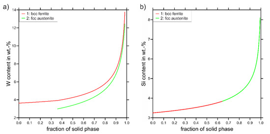 Element concentrations in the fcc and bcc phases, derived from Scheil–Gulliver solidification simulations. (a) W in the X2CrNiW15-9-5 steel and (b) Si in the X2CrNiSi18-9-4 steel (Thermo-Calc 2020b, TCFe10 database).