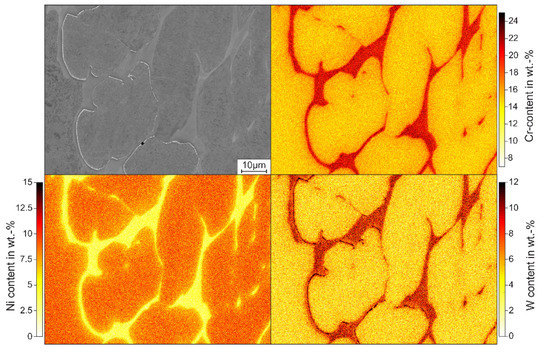 The local element distributions in the X2CrNi18-9 steel shown in Figure 4 indicate that in addition to the previously mentioned partitioning of Cr and Ni into austenite and δ-ferrite, concentration gradients also exist within the austenite. With increasing distance from the ferritic sites, the Cr content decreases within the austenite, while the Ni content increases. This is the result of the solidification and transformation sequence during cooling. Usually, the Cr content of the primary solidifying ferrite is higher than the average Cr content of the melt, and vice versa for the Ni content. Due to the enrichment of the melt with Ni and its depletion with Cr, the Cr concentration of the further solidifying ferrite decreases, while the Ni concentration increases, until the beginning of the precipitation of the austenitic phase from the melt [35]. During the subsequent cooling, starting from the last-solidified, low-Ni ferrite, a ferrite–austenite transformation takes place, so that the concentration profiles described are present in the austenite in the as-cast state. The described tendency can also be observed in the case of the X2CrNiW15-9-5 steel (Figure 5), but not in the X2CrNiSi18-9-4 steel (Figure 6). The reason for this may be that in the latter, no significant ferrite–austenite transformation occurs during cooling.