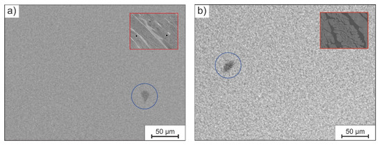 CT slices of the steels: (a) X2CrNiW15-9-5; (b) X2CrNiSi18-9-4. Blue circles highlight the non-metallic inclusions. The red boxes contain SEM images of each steel’s microstructure for comparison.