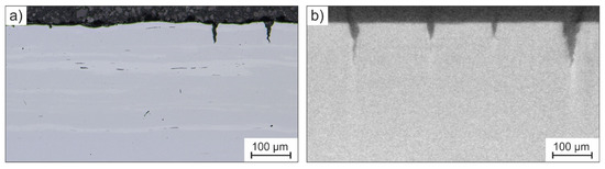 The hydrogen embrittlement of austenitic stainless steels has been the subject of intensive research efforts for many years [1,2,3,4,5,6,7,8,9]. Present ambitions to use hydrogen as an energy carrier in the context of developing renewable energies are leading to increased interest in this field of research. The term “hydrogen embrittlement” covers many different phenomena; however, all have a degradation of the mechanical properties of a particular material due to the presence of hydrogen in common [10]. The hydrogen embrittlement of steels that are used in hydrogen-containing atmospheres is mostly referred to as “hydrogen environment embrittlement” (HEE). HEE incorporates the uptake of hydrogen atoms from the surrounding atmosphere and the formation of hydrogen-induced cracks, which initiate a premature failure [11]. One of the standard test procedures used to examine the susceptibility of austenitic stainless steels to HEE is a slow strain-rate tensile test, conducted in a high-pressure hydrogen gas atmosphere [12]. Although CrNi-type austenitic steels are generally less susceptible to HEE than ferritic or martensitic steels, especially lower alloyed grades, e.g., AISI 304L, often show failure, along with reduced ductility [13]. Hydrogen-induced surface cracks are characteristic features that can be observed on tensile specimens after tensile testing in hydrogen gas atmospheres [12]. The properties of these circumferential surface cracks, which are also referred to as “secondary cracks” in the literature, are often assessed to discover the specimen’s susceptibility to HEE, as well as the embrittlement process itself [14,15,16].