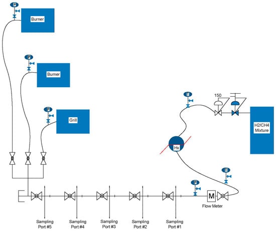 The primary goal of the experiment was to replicate modern gas distribution pipeline conditions and determine what, if any, separation would naturally occur when hydrogen and methane, the primary components of natural gas, are blended. To accomplish this task, a 100 linear foot section of 2-inch diameter high density polyethylene (HDPE) pipe was erected horizontally outdoors. This material and size of pipe are the most common being installed today by National Grid, including in those areas where hydrogen blending is expected. HDPE pipelines less than 4” in diameter represent more than 25% of the miles of pipeline in operation today []. The pipeline section was operated under shade to prevent heating from the sun, thus creating temperature variations. Sampling ports were installed at the top and bottom of the pipe, at the 6 and 12 o’clock orientations and every 20 feet, to collect gas samples that could be analyzed utilizing a commonly used portable gas chromatograph, a Micro GC Fusion 3-Module System Micro Gas Chromatograph []. A heat exchanger was assembled to heat/cool depressurized gas to keep temperatures controlled. The gas at the outlet was connected to a commercially available outdoor cooking grill to mimic household gas loads, and a standard flow meter was used to monitor the outlet gas flow rate. The entire arrangement is shown in Figure 1.