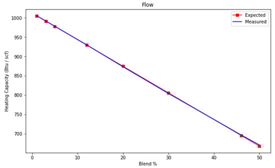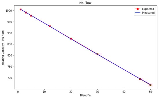 Table 5 shows the measured results during no-flow conditions. The results show a near perfect correlation between measured and expected HHV or Btu content. Figure 3 presents the data from Table 4 in graphical form and shows the near perfect correlation between the expected and measured results. There was also virtually no difference in the results under no-flow conditions despite the gas having more time to separate. The blended gas had a nearly identical composition, further establishing that the gas was homogenous. The results displayed in Figure 3 are nearly identical to those in Figure 2.