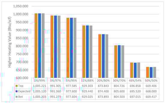 While the data show a clearly homogenous mixture at all blends and pressures, one of the key goals of this experiment was to determine whether any stratification vertically would occur. In essence, would the less dense hydrogen molecules begin to separate vertically in the pipe from the methane in the blend? Considering data collected under flow and no-flow conditions, the results continued to show complete homogeneity. The largest difference between the top and the bottom measured gas composition was 0.278, which is equivalent to a difference of 0.0003%. Figure 4 is a graphical representation of the data in Table 4 and Table 5 and shows the expected HHV for each blend rate, along with the measured values for all pressures, including all top and all bottom sampling data.