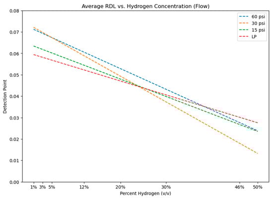 In New York State, the RDL of gas delivered should at no time exceed 0.50% gas in air []. The odorant measurements in this experiment varied within a range apparently consistent for pressure and flow throughout the experiments. The samples with higher hydrogen blend rates tended to exhibit and maintain higher mass concentrations of odorant and lower RDL values, as shown in Figure 5. In all, a total of 84 samples were tested for odorant detectability from samples at all test conditions.