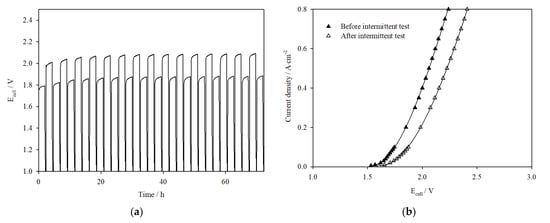 - Rakousky, C.; Keeley, G.P.; Wippermann, K.; Carmo, M.; Stolten, D. The stability challenge on the pathway to high-current-density polymer electrolyte membrane water electrolyzers. Electrochim. Acta 2018, 278, 324–331. [Google Scholar] [CrossRef]
