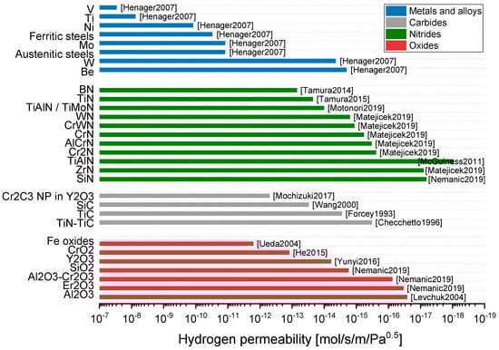 As for nitrides, the research focus lies on TiN [59], BN [60] and SiN [23]. By combining TiN and AlN in a TiAlN coating, the most promising permeabilities in the order of are achieved, using deposition methods such as magnetron sputtering with Ti and Al targets in an atmosphere containing nitrogen [61] and arc discharge in a nitrogen atmosphere from cathodes composed of Al and Ti [62]. Barrier coatings containing oxides, carbides or nitrides are suitable for improving the barrier properties of ferritic or austenitic steels which typically have permeabilities in the order of [63]. An overview of the hydrogen permeabilities for a variety of barrier coatings and for a selection of oxides, nitrides, carbides, metals and alloys is given in Figure 3.