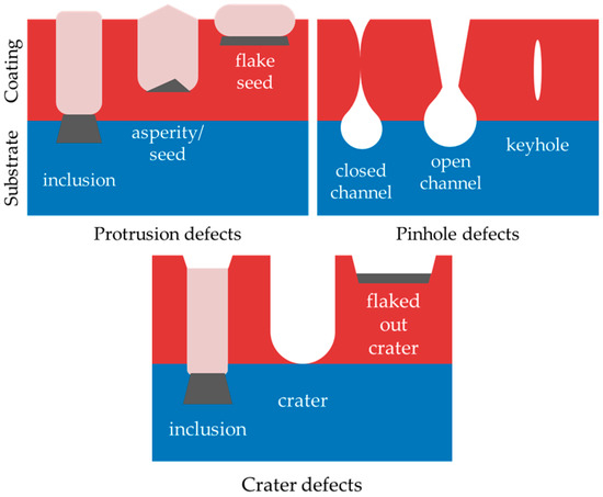 Schematic overview depicting the main types of growth defects occurring in PVD thin films—protrusion defects, pinhole defects and crater defects—caused by foreign particles, irregularities of the substrate and internal stress or external impact (modified after [83]).