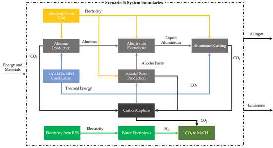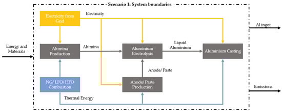 In scenario 1, the required thermal energy is provided by fossil fuels combustion, namely a mixture of NG, LFO and HFO. Electricity for the different production stages is supplied by the grid. The anodes and pastes required for the Al electrolysis are produced in the plant’s premises, as is often the case. Overall, this scenario simulates a conventional primary Al production process, to serve as the base case for the analysis. The system boundaries for scenario 1 are shown in Figure 1.