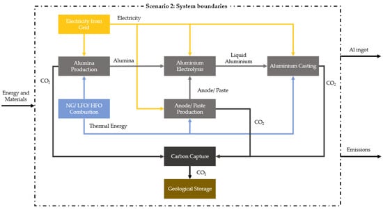 In scenario 2, CO2 is captured from the off-gases of the alumina production stage, using a conventional amine-based system. CO2 in the off-gases is absorbed by an aqueous amine solution in an absorption column. Afterwards, the high CO2 containing amine (rich amine) is fed to a desorption column where CO2 is separated to be stored, while the amine is fed back to the absorption column to repeat the process. The captured CO2 is compressed and sent by pipelines to a geological storage site, specifically a storage well, constructed in a saline aquifer. The production of Al ingot is considered identical to scenario 1, including both fossil fuel combustion and electricity supply. The system boundaries for scenario 2 are shown in Figure 2.