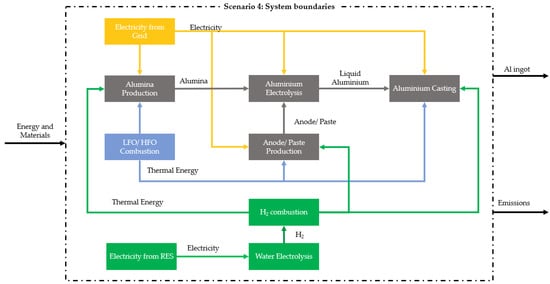 Scenario 4 utilises green H2 to replace NG for the production of the necessary thermal energy. Accordingly, an H2 burner is selected, as shown in Section 3, to produce high-grade heat for the processes. For the production of 1 MJ thermal energy, the selected H2 burner requires 0.008 kg of H2. The required H2 is produced by water electrolysis, using electricity from photovoltaics. The system boundaries for scenario 4 are shown in Figure 4.
