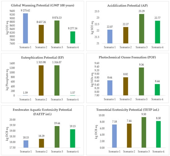Scenario 4, replacing of NG with H2, appears to be the most environmentally beneficial of the different options. Considering air emissions, combustion of H2 accounted for a GWP reduction of 10.76%, 8277.16 kg of CO2 eq. compared to 9275.62 kg CO2 eq. for the base case. In the same manner, EP and POF were reduced by 1.26% and 2.31%, respectively. On the other hand, AP showed an increase of 3.17%, due to the increased electricity demand for H2 production, which accounted for 1.05 kg SO2 eq., even when produced by RES such as photovoltaics, compared to 0.54 kg SO2 eq. from NG combustion. In terms of freshwater and terrestrial ecotoxicity, the FAETP and TETP increased by 15.60% and 5.51%, respectively, as a result of the electricity required for H2 production.