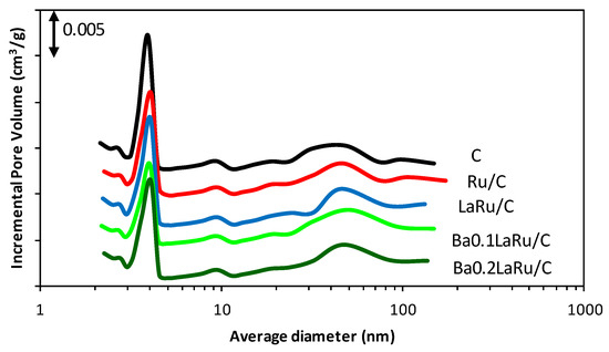 Figure 1 shows the pore size distributions of the carbon support and four Ru/C-based catalysts. As seen in Figure 1, the studied materials had a mesoporous structure. The pore size distribution plots exhibited, in general, bimodal forms. Two peaks were registered. First, a high and narrow signal was obtained at about 3–5 nm pore diameter for all studied materials. Its area was the largest for the support material (C) and the lowest for the Ba0.1LaRu/C sample. This effect is consistent with the textural data collected in Table 1, since the smallest pores have the most significant impact on the specific surface area. Introduction of any additional components on the support caused the decrease in this peak, and its maximum was shifted toward larger pore sizes. This is connected with the blockage of small pore entrances with deposited particles. The second broad peak was observed in a range of 30–80 nm pore diameters. The shape of that signal changed slightly with sample composition, but no significant effects were observed.