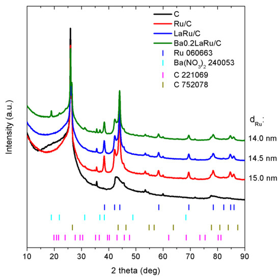XRD characterization was performed for C support, Ru/C after ruthenium precursor reduction, and impregnated, but uncalcined, LaRu/C and BaLaRu/C catalysts. The experiments were performed for all studied materials, but for the clarity of the presentation, only one of the Ba-containing samples was chosen. The obtained diffraction patterns and the average ruthenium particles’ sizes estimated on the basis of Ru diffraction signals (dRu) are presented in Figure 2.