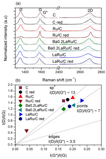 Intensity ratios of D and G peaks for the initial and reduced samples were estimated on the basis of Raman spectra and plotted in Figure 4b as a function of an I(G*)/I(G) intensity ratio. Dashed lines in Figure 4b present defect type in sp2 structure [75]. For almost all the tested samples, the ID/IG ratio exceeds 1, which is characteristic for disordered carbon structures [73]. Most of samples are between the region of sp3 defects and point defects (vacancies), except Ru/C red, whose Raman spectrum is significantly different. The I(D)/I(G) ratio of Ru/C red is much lower than that of the other samples, which means that, in this case, the graphitic phase (sp2) significantly outweighs the sp3 phase. Additionally, the G* peak for Ru/C red has very low intensity, so most of the defects in the structure can be associated with the rest of the sp3 phase. Interestingly, for Ru/C and LaRu/C materials, we observed a decrease in the I(D)/I(G) ratio as a consequence of reduction. In the first case, the change was impressive: from 1.57 for Ru/C to 0.48 for Ru/C red. In the latter, the I(D)/I(G) ratio decreased from 1.48 for LaRu/C to 1.29 LaRu/C red. The opposite effect was obtained for Ba0.2LaRu/C catalyst, from 1.20 to 1.32 after reduction.