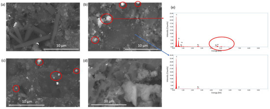 SEM images were acquired with a Helios PFIB microscope from ThermoScientific, equipped with an integrated EDX analysis system in high vacuum mode using both an Everhart-Thornley Detector (ETD, secondary electrons) and a Circular Backscatter Detector (CBS, back-scattered electrons), with a working distance of 6–8 mm, as well as an accelerating voltage of 15 kV, at different magnifications. The EDX elemental maps were obtained using the same parameters with the Drift Correction function enabled and were analyzed with APEX software.
