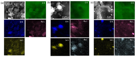 The backscatter images of all four samples are shown in Figure 5. While regular SEM images differentiate topography, these images show a contrast between particles with different masses. Hence, ruthenium, barium, and lanthanum appear as light spots, which contrast with the dark (carbon) background. Well organized, stick-shaped structures have been visualized as carbon supports in Figure 5a. That observation confirms the fact of partial graphitization of the support material. It can be seen that the samples, which do not contain barium, i.e., Ru/C (Figure 5a) and LaRu/C (Figure 5d), contain only small, irregularly-shaped specks, which are very bright, whereas the two others have round sphere-like particles. EDX spectra of these particles shows a pronounced increase in lanthanum and barium in them in comparison to the background, where these levels are low. The presence of barium and lanthanum in the agglomerates may indicate an interaction of barium oxide with lanthanum. The elemental maps confirm that lanthanum is distributed evenly across the surface of the sample when no barium is present (Figure 6a). In contrast, the two samples with barium and lanthanum (Figure 6b,c) show that these two elements are associated with oxygen and tend to form round particles. The SEM data support our hypothesis about interaction of lanthanum and barium when introduced simultaneously on the Ru/C surface upon preparation.