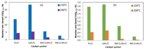 For all tested temperatures (270, 240, 220, and 200 °C), the promoting effect of La in catalysts with only this promoter was clearly observed. The highest CO removal rate was obtained over the LaRu/C catalyst. The value of 23.46 mmol CO/(gC+Ru×h) reached by LaRu/C at 270 °C is almost two times higher than that obtained for the undoped Ru/C material: 13.68 mmol CO/(gC+Ru×h). The promoting effect of La is considerably greater than that presented in our previous paper [29]. The reaction rates obtained over Ru/C could be compared to those reported for the catalysts supported on different oxide materials, characterized by the same Ru loading (5 wt.%), similar Ru dispersion, and amounts tested (150 mg of catalyst), described in [76]. At 200 °C, the Ru/C catalyst reached 0.66 mmol CO/(gC+Ru×h). This activity level is lower than that obtained for Ru/CeO2 at 215 °C: 1.98 mmol CO/(g*h). However, it is higher than that obtained for Ru/SiO2 at 215 °C: 0.47 mmol CO/(g×h) [76]. However, the differences in experimental conditions, such as gas composition and the total flow rate, hinder the direct comparison.