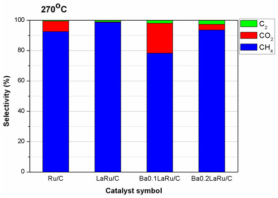 Figure 8 reveals that the selectivity in the studied reaction depends on the catalyst composition. In the mixture of carbon-containing products analyzed at 270 °C, the highest fraction is that of methane. It is around 92% for Ru/C, above 98% for LaRu/C, and 93% for Ba0.2LaRu/C. The value obtained for the sample Ba0.1LaRu/C was the lowest, reaching only 78% (Figure 8). At other studied temperatures, the highest selectivity to methane was obtained for the LaRu/C catalyst (Figure S1), and that regularity remained unchanged within the studied temperature range. For all the catalysts, we observed an increase in the carbon dioxide ratio in the product mixture with decreasing reaction temperature. The effect was the most significant in the case of the Ba0.1LaRu/C system. CO2 can be produced in the exothermic water–gas shift (WGS) reaction (CO + H2O ↔ CO2 + H2; ΔH° = −41.2 kJ/mol) [81]. Another possible source of CO2 observed at temperatures below 300 °C [11] may be the Boudouard reaction: 2CO ↔ C + CO2 ΔH° = −172.4 kJ/mol [82]. Higher hydrocarbons (C2) are products of Fischer-Tropsch synthesis [22], which can take place in the studied gas mixture. Our results are in agreement with the report of Zamani [55], in which the simultaneous introduction of Ba and La promoters to an iron catalyst significantly improved its WGS activity. The authors claim that the reason for this was the synergistic effect and basicity of the promoters [55]. In our case, these two elements used together also seem to promote the side reaction to methane formation (Figure S1). Comparing the selectivity results (Figure 8 and Figure S1) with those of activity (Figure 7), it should be noticed that the highest activity in CO conversion obtained in the case of the LaRu/C catalyst corresponds to a higher selectivity to methane.