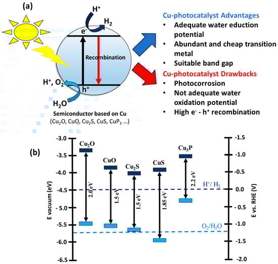 (a) Scheme of photo-catalysis on a Cu-based semiconductor and the advantages and drawbacks of its use in H2 production. (b) Energy band diagram of several Cu-based semiconductors.