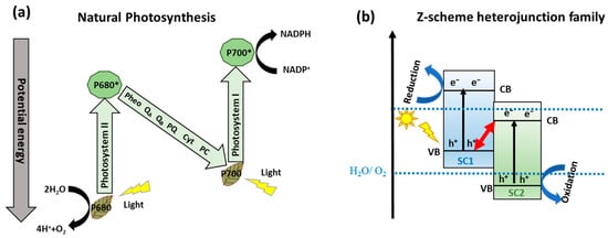 (a) Scheme of natural photosynthesis mechanism process. Reproduced from [38]. (b) Z-scheme schematic diagram for two semiconductors. Adapted from [46].