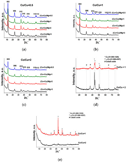 XRD patterns of CuCoMgAl-systems: synthesized samples with the ratio (a) Co/Cu = 0.5, (b) Co/Cu = 1, and (c) Co/Cu = 2; (d) samples with the ratio Co/Cu = 1 and Co/Cu = 2 at ratio (Co + Cu)/Mg = 2 after calcination and reduction at 800 °C; (e) samples with ratio Co/Cu = 1 and Co/Cu = 2 at ratio (Co + Cu)/Mg = 2 after hydrogenation of furfural.