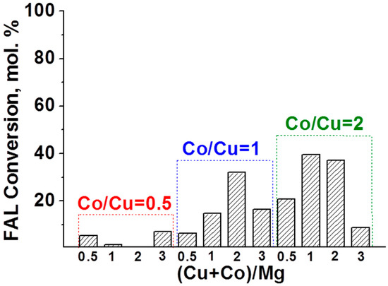 According to obtained data, FAL conversion increased with the increase of Co/Cu ratios for the samples with the same (Cu + Co)/Mg ratio (Figure 2). For the samples with Co/Cu = 0.5 FAL, conversion did not exceed 7%. In the group of samples with the same Co/Cu ratio, an extreme dependence of FAL conversion on the (Cu + Co)/Mg ratio was observed. So, at Co/Cu = 1, the maximum FAL conversion was equal to 32% for the sample with (Cu + Co)/Mg = 2. The further increase in the proportion of divalent metals in the sample with (Cu + Co)/Mg = 3 led to the decrease of FAL conversion by up to 16%. For the samples with Co/Cu = 2, the FAL conversion reached 40% and 37% for the catalysts with (Cu + Co)/Mg = 1 and 2, respectively (Figure 2).