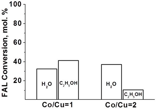 According to obtained data, a significant change in activity was observed when changing the Co/Cu ratio with the use of ethanol as a solvent (Figure 3). FAL conversion for the sample with Co/Cu = 1 increased from 32 to 42% when replacing water with alcohol. At the same time, a great decrease of the FAL conversion from 37 to 10% was observed with an increase in the Co/Cu ratio of up to 2. It is known that there are two main functions of the solvent in the reaction. The first one is the interaction with organic substrates, and the second one is the interaction with the surface of metallic catalysts with a change in their reactive ability. The solvent is capable of facilitating desorption of hydrogenation products from the surface of the catalyst by forming hydrogen bonds with them. These aspects are of great interest to researchers, and are valuable methods to control selectivity, if necessary, to minimize by-products [7,28,29]. It is important to note that the change in the solvent did not affect the direction of FAL transformations. FOL was the main product, with the selectivity >99%.