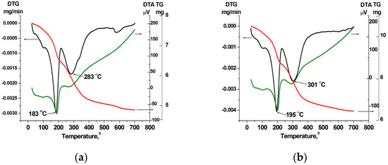 The processes occurring during the oxide phase formation were studied using thermal analysis (Figure 4). Two areas of mass loss were observed for these systems: the first was in the temperature range of 130–220 °C, with a maxima of mass loss at 183 and 195 °C, and the second was in the range of 240–450 °C, with a maxima of temperature of 283 and 301 °C, for samples with a ratio of Co/Cu = 1 and 2, respectively. According to data from the literature, the removal of adsorbed water occurs in the first stage of mass loss, and the dehydroxylation of brucite-like layers and the removal of interlayer anions take place at higher temperatures for the samples with LDH structures [31]. The weight loss at the first stage was 13.1–13.4%, and at the second stage was 17.5–18.3% for the samples with Co/Cu = 1 and 2, respectively. Such thermal behavior of synthesized systems serves as additional proof of the formation of a single-phase LDH structure.