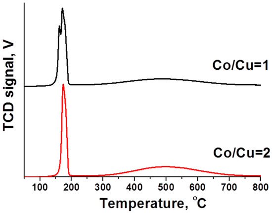 In accordance with TPR data, the reduction process of CuCoMgAlOx-mixed oxides occurred stepwise. The first stage of metal reduction was observed in the temperature range of 150–200 °C. It was characterized by a narrow, high-intensity peak, with maximum hydrogen consumption occurring at 171 °C and 173 °C for the samples with Co/Cu = 1 and 2, respectively (Figure 5). At the second stage, a wide, low-intensity area of hydrogen consumption was observed at higher temperatures (350–700 °C). Such stepwise reduction characteristics may be explained by the presence of both monometallic oxides, CuO and Co3O4, and mixed oxides, CuAlOx, CoAlOx, and non-stoichiometric CuCoAlOx, in the composition of the CuCoMgAlOx-mixed oxides after their calcination.