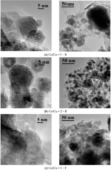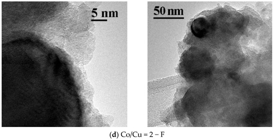 Often, changes in the microstructures of catalysts, the particle sizes of active metals, metals sintering, etc., was observed during the reaction. Ultimately, this can have a significant impact on the stability of the samples. It is very important since, as noted earlier, one of the disadvantages of Co and Cu-containing FAL hydrogenation catalysts is their rapid deactivation [7]. Therefore, the samples with Co/Cu = 1 and (Co + Cu)/Al = 2 both after calcination and reduction, and after the reaction of the aqua phase FAL hydrogenation were studied by TEM (Figure 6).